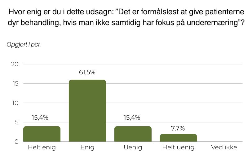 I en spørgeskemaundersøgelse foretaget af Medicinske Tidsskrifter har 26 yngre onkologer svaret på deres holdning til ernæringsindsatser for kræftpatienter. Her er 76,9 procent ”enig” eller ”helt enig” i, at det er formålsløst at give patienterne dyr behandling, hvis man ikke samtidig har fokus på underernæring. I undersøgelsen svarer 65,3 procent også, at de har oplevet at måtte udskyde en medicinsk eller kirurgisk behandling på grund af patientens ernæringstilstand.