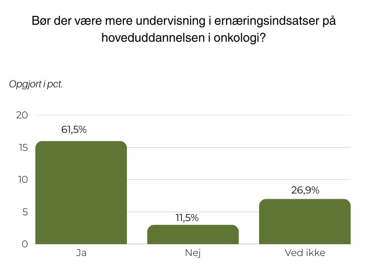 Det er ikke nok, mener de yngre onkologer. I en spørgeskemaundersøgelse foretaget af Medicinske Tidsskrifter har 26 yngre onkologer svaret på deres holdning til ernæringsindsatser for kræftpatienter. Her vurderer 34,6 procent, at undervisningen i ernæringsindsatser på hoveduddannelsen er ”utilfredsstillende” eller ”meget utilfredsstillende”. Og 61,5 procent mener, at der bør være mere undervisning i ernæringsindsatser på hoveduddannelsen.